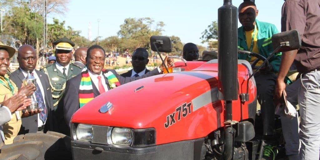 Cotton Section Overall Winner Mr Robert Madhlazi receives a tractor from His Excellency President Emmerson Dambudzo Mnangagwa at the Harare Agricultural Show in August 2019.
