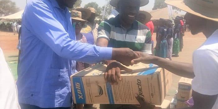 Vice President of The Republic of Zimbabwe K.C.D Mohadi handing over Presidential Inputs to cotton farmers in Lusulu at the launch of the inputs and tillage programme with The Cotton Company of Zimbabwe Limited Managing Director Mr P Manamike.